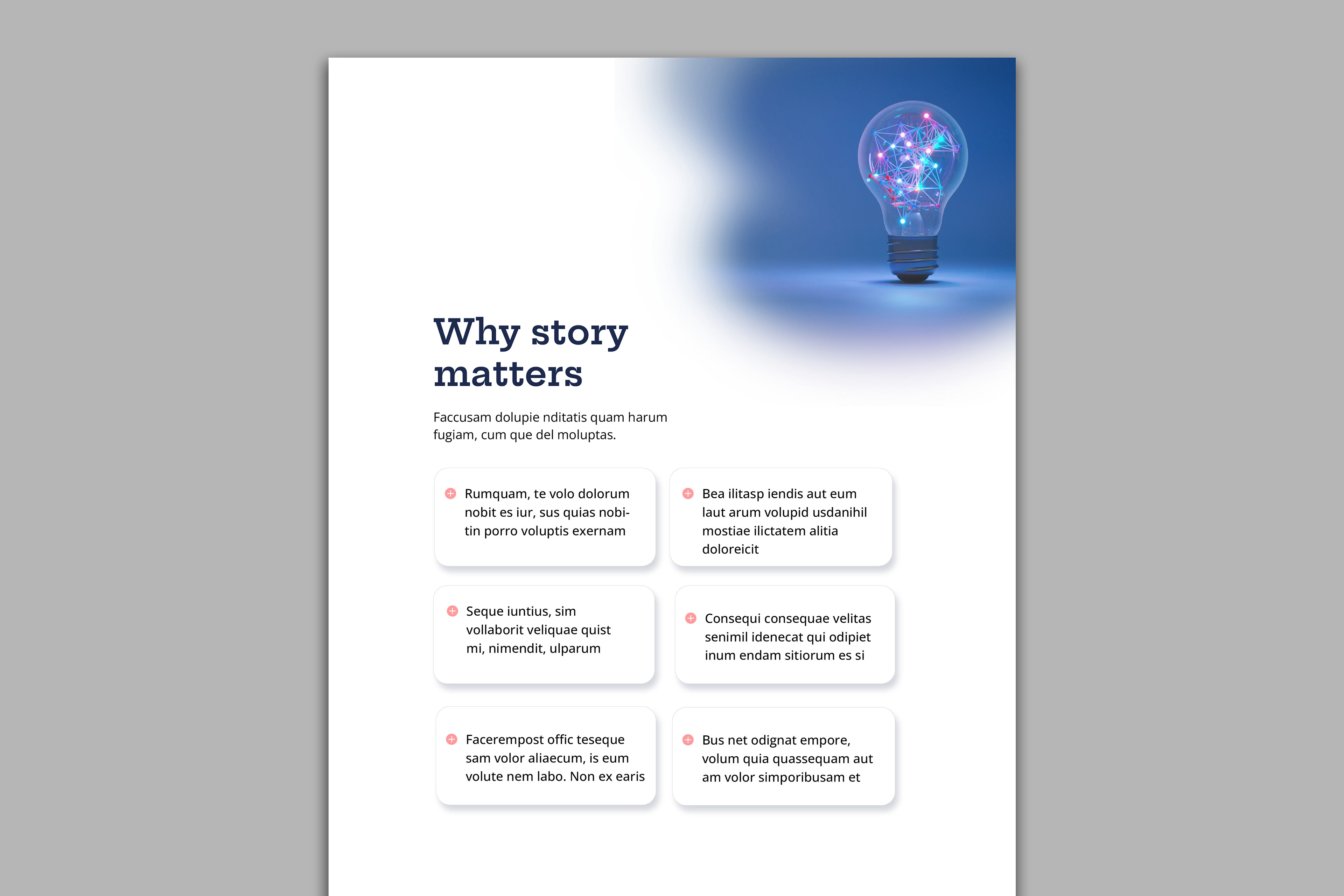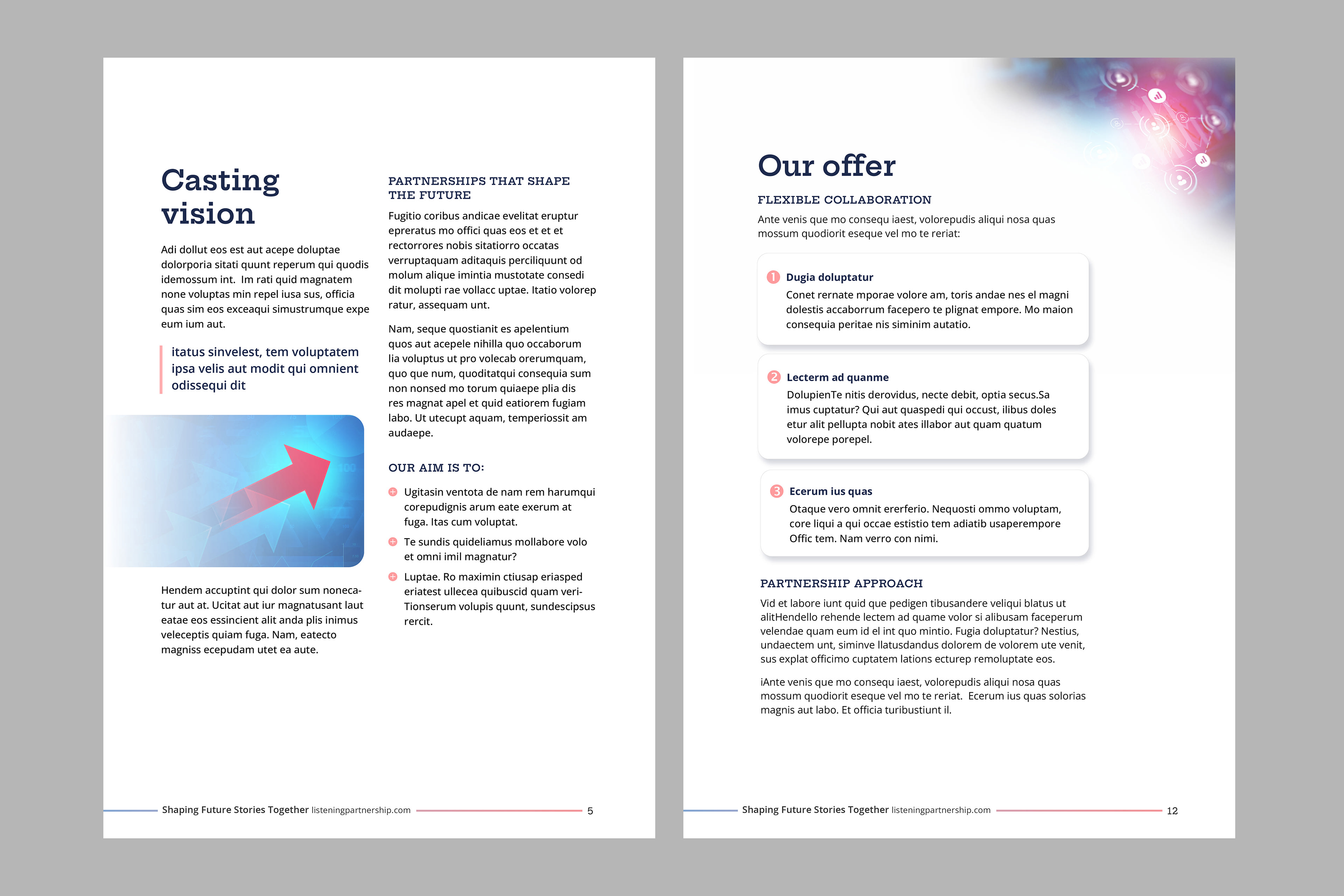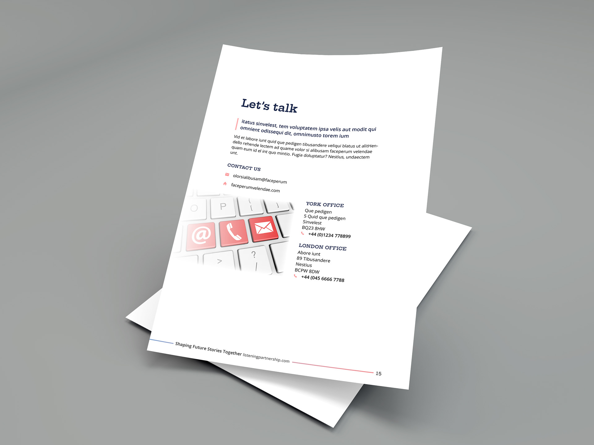 Design Focus: I implemented a structured typographic scale, standard business conventions and a grid system. White space, consistent layouts and supporting imagery was used to improve readability and engagement.
